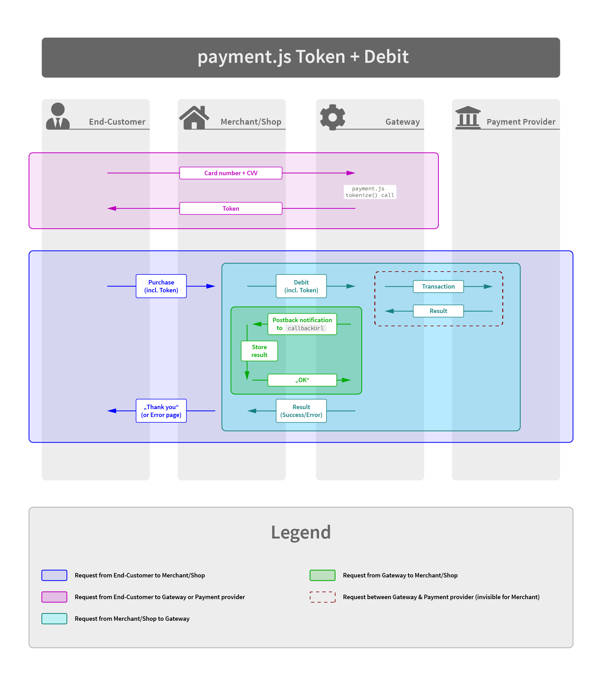 tokenize callback you submit your part of the payment form to your backendtransactionTokenFINISHED, PENDING or ERROR.Some transactions just require some Server-to-Server communication, without involving the end-user directly into the payment process. Typical examples are: Recurring payments, Refunds, De-Registering of a payment method, Capture or Void of a previous preauthorization.